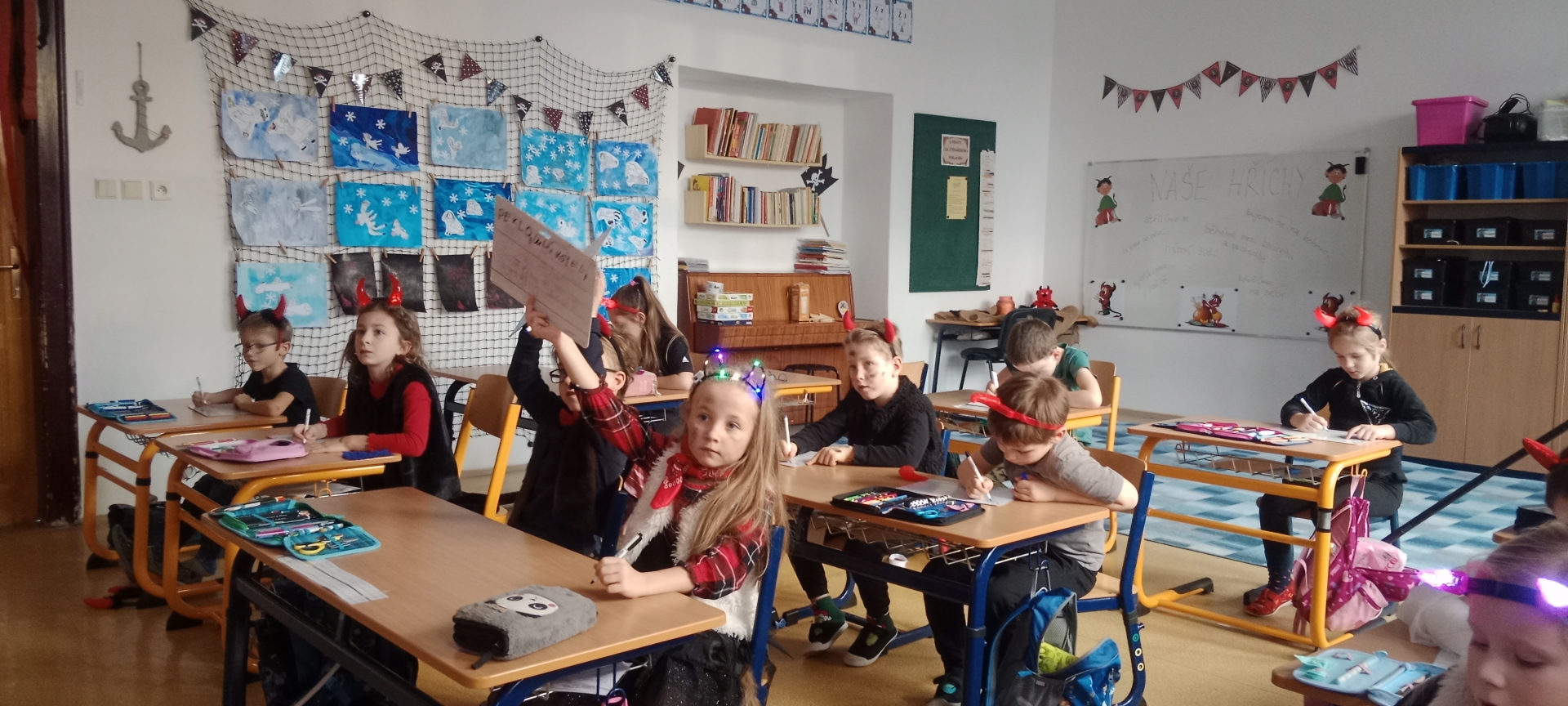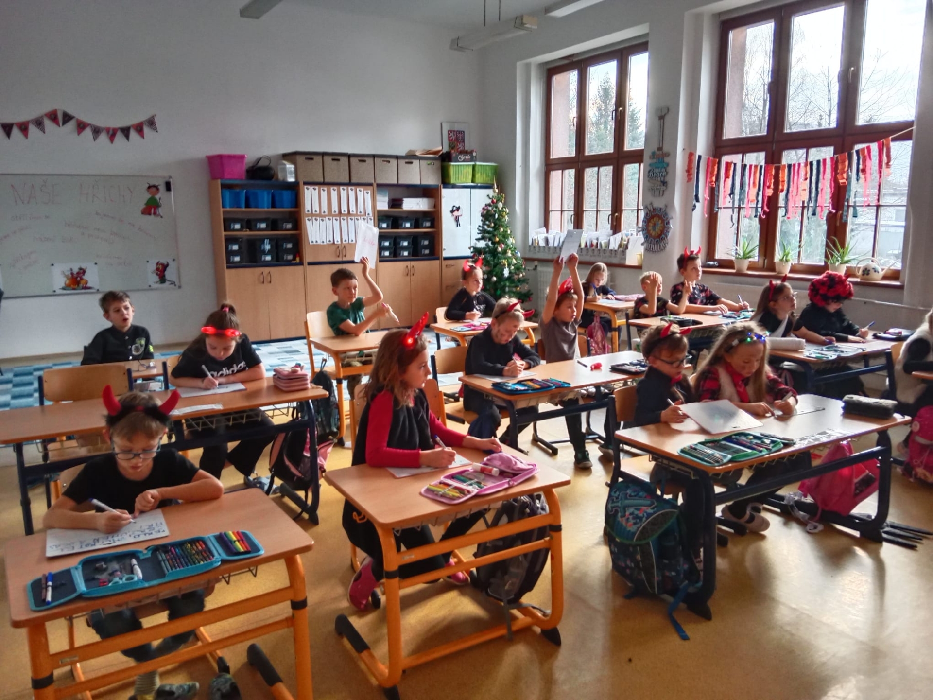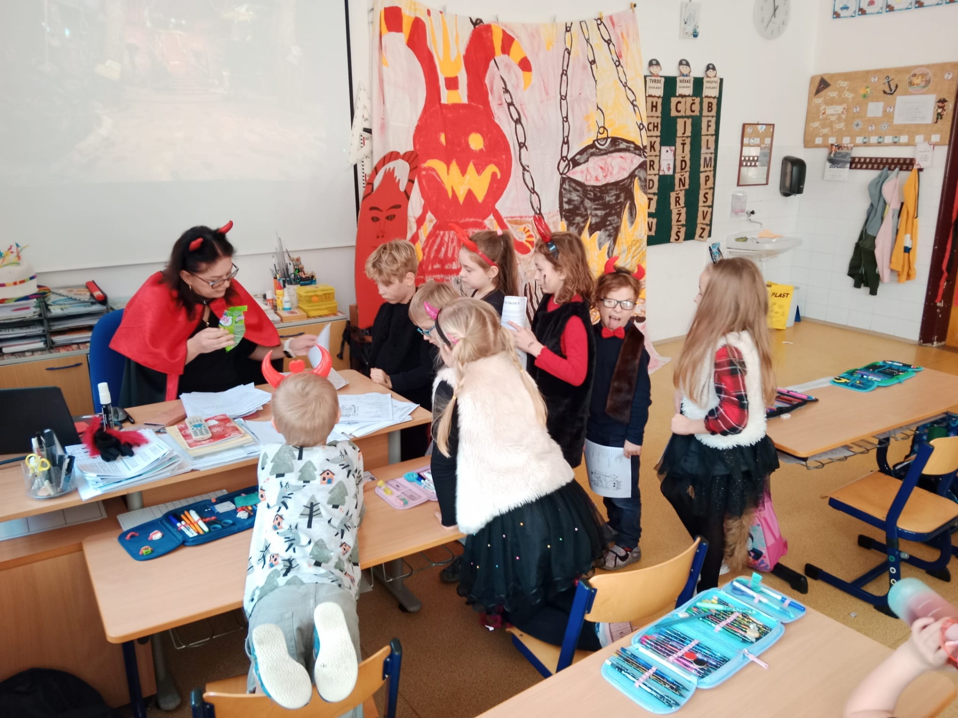 Děti druhých tříd, naši čerti a naše čertice v rouše beránčím, dnes navštívili čertovskou školu. Četli, psali, počítali, řešili, cvičili, tančili, vyráběli a hlavně si užívali školu jinak.